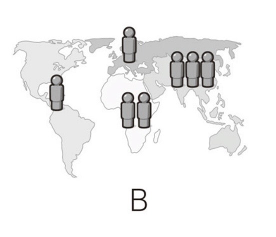 質問8:現在、世界には約70億人の人がいます。次の地図では人の印がそれぞれ10億人を表しています。世界の人口分布を正しく表しているのは、3つのうちどれでしょうか?